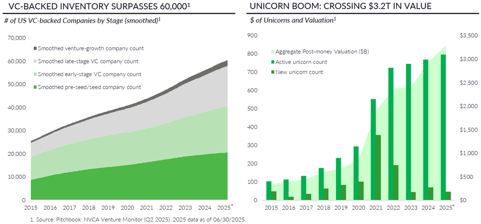 Although the IPO window is slowly reopening, approximately $3.2T of value remains locked in private unicorns.1 Many of the largest unicorns continue to attract strong private demand for both primary and secondary transactions, leaving them with limited incentives to go public. Meanwhile, there are over 60,000 active US venture-backed companies that ultimately require an exit pathway.1 As venture becomes increasingly institutionalized, particularly with the rise of megafunds (VC funds >$1B in fund size), we anticipate a sustained and meaningful expansion in the number of VC-backed companies.